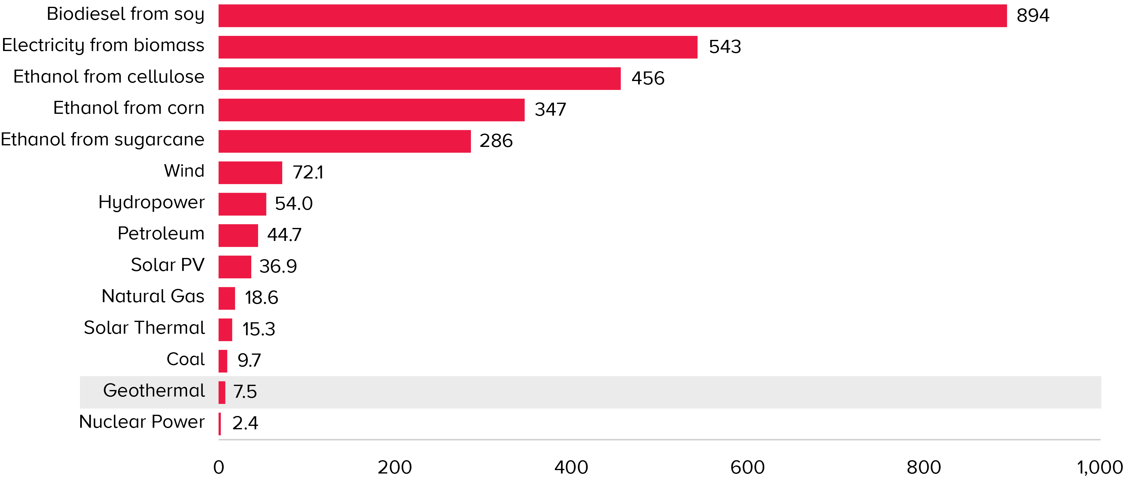 Next to nuclear power, geothermal energy is the least land-use intensive of all zero-emission electricity technologies, because the energy extraction takes place under the Earth’s surface through wells with comparatively small footprints. In the U.S., geothermal land-use efficiency is projected at 7.5 km2 per terawatt/hour (TWh) by 2030. This is impressive compared to solar energy that requires double the land per generated TWh and wind power that requires roughly ten times as much land.
