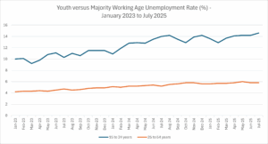 Youth unemployment has steadily ticked upward. In the last three years, while unemployment has increased by about two percentage points for 25–54-year-olds, unemployment for 15- to 24-year-olds has increased by four percentage points, from 10.3 per cent in July 2023 to 14.6 per cent in July 2025.