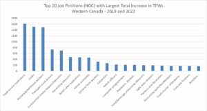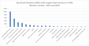 There were more TFW food service and retail positions — sectors that have traditionally employed youth — in 2022 than there were before the pandemic. With the curbing of these changes and more restrictions, there has been a modest rebalancing toward roles that typically attract fewer young workers, but food service and counter positions still maintain a high proportion of TFWs.