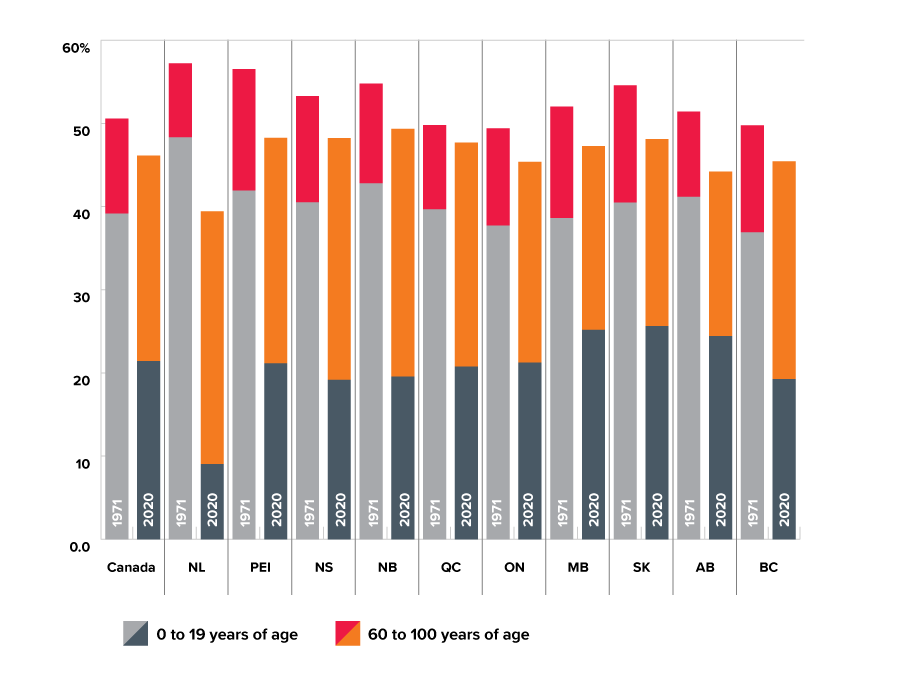 The shift in age distribution of the population is equally visible when comparing the proportion of children compared to seniors. In 1971, 39.1% of Canada’s population was between the ages of 0 and 19 years; 11.4% of the population was between 60 and 100 years of age.