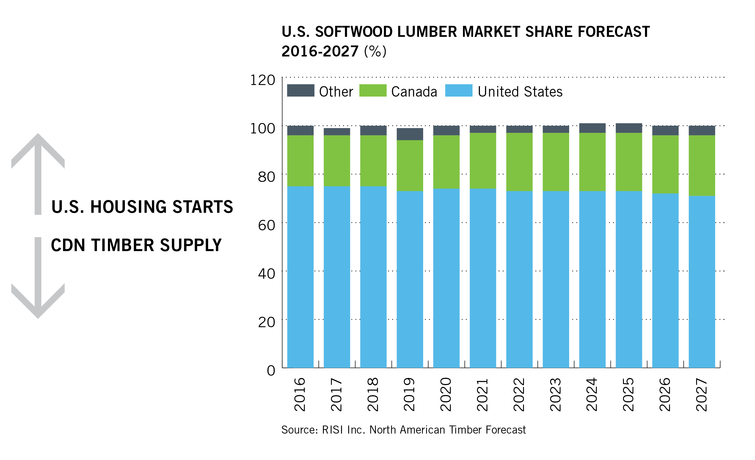 The last SLA capped Canada’s share of the U.S. lumber market at 34 per cent. Historically, Canada has occupied an average of 30 per cent. We currently hold about 27 per cent. Due to declining timber supply, a decade from now that is projected to drop to 25 per cent.