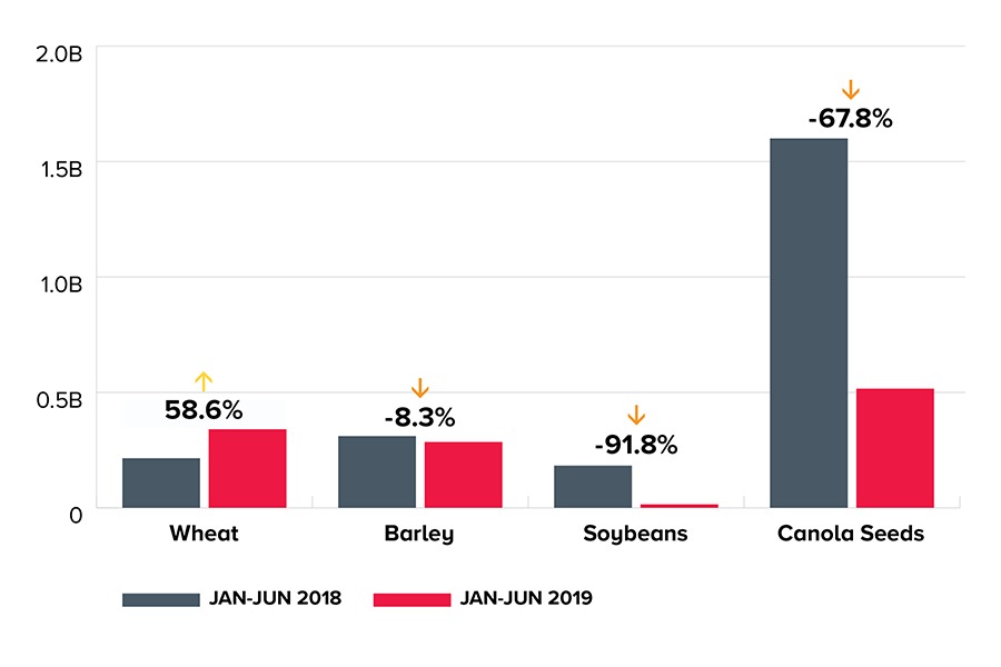 MAJOR CROP EXPORTS TO CHINA, JAN-JUNE 2018 VS. JAN-JUNE 2019 ($CAD)