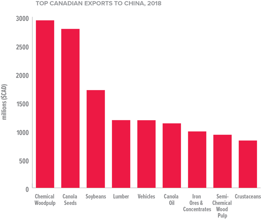 Some Canadian agricultural exports rely on China as their largest market. For example, in 2018, 60% of Canadian soybeans were sold to China; 53% of flaxseed; 48% of canola seeds; and 75% of barley.