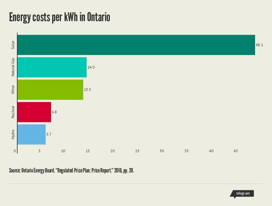 Current nuclear electricity costs in Ontario, the only province in Canada with a significant proportion of grid power coming from nuclear energy. This represents pricing from current reactors – new reactors with improved efficiency or differing methods of energy extraction will not only improve safety; they should also lower the cost per kwh.