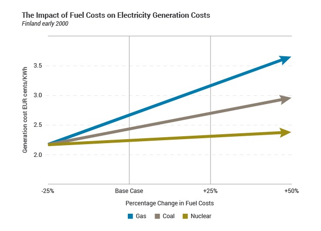 Operating costs have always given nuclear power an advantage compared with other types of generation that require fuel input, such as coal, oil, and gas-fired plants. Uranium, with current technologies, must be processed, enriched and fabricated into fuel elements, and about half of the total fuel cost is due to enrichment and fabrication. In the assessment of the economics of nuclear power, how to manage – and eventually dispose of – radioactive spent fuel must be considered. But, even with these included, the total fuel costs of a nuclear power plant in the OECD are typically about one-third of those for a coal-fired plant and between one-quarter and one-fifth of those for a gas combined-cycle plant. In a coal-fired plant, 78% of the cost is the fuel, for a gas-fired plant, the figure is 89%, and for nuclear the uranium is about 14% (or about double that to include all front-end costs). Also, since uranium makes up less than 30% of the total cost all told – and because such a small amount is needed to generate power – a sudden price increase for this mineral would have a miniscule effect on customers. Fossil fuels, on the other hand, are responsible for close to 80% of the total production costs for combustion electricity generation, and are much more volatile.