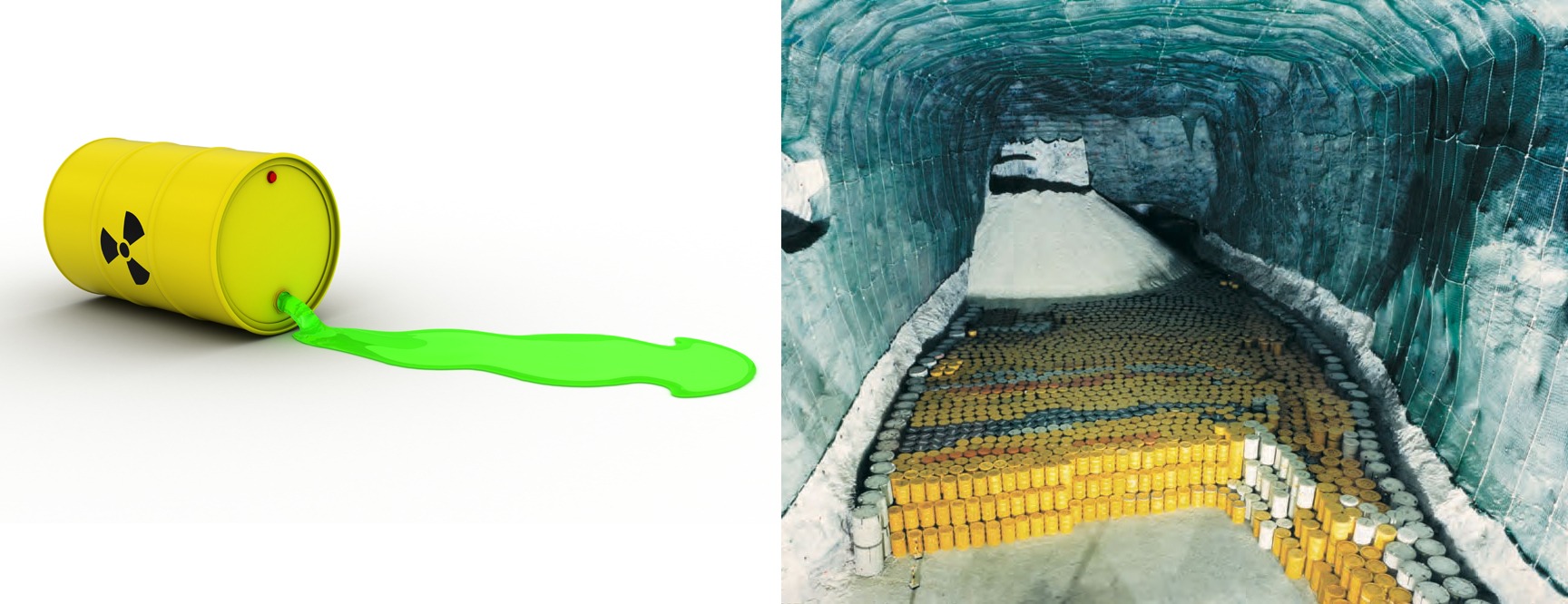 Right: Underground nuclear waste repository for low-level radioactive wastes, stored in steel drums.