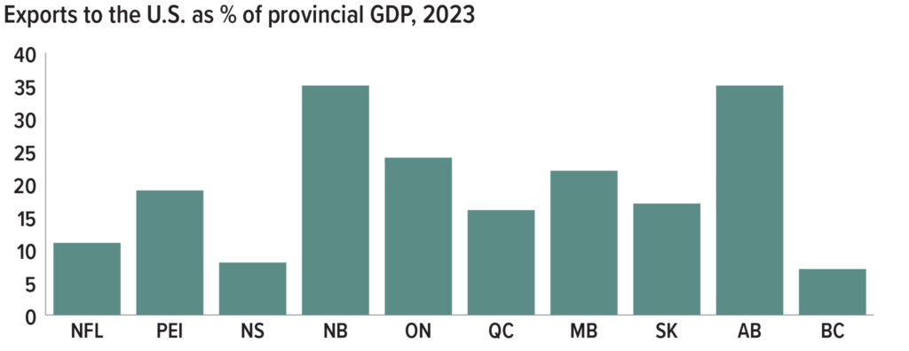 In terms of the importance of trade with the U.S. as measured by share of provincial GDP, Alberta and New Brunswick far outstrip Ontario and Quebec. Further, in the West, Saskatchewan exceeds and Manitoba equals Quebec in terms of impact. In the Maritimes, PEI rises above Quebec in terms of the impact of exports to the U.S. on provincial GDP.