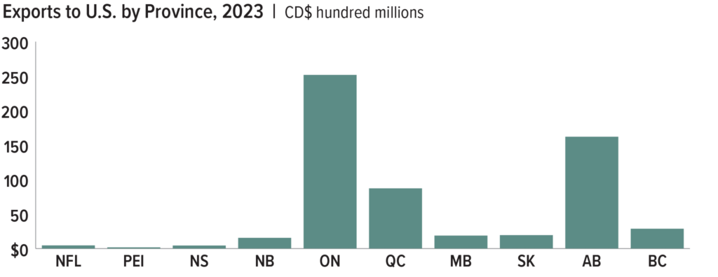 Stay tuned for an analysis of what the ending of the CUSMA agreement would mean for the Western provinces. We are in the process of conducting a deep, analytical dive and analysis. Here’s an example of what we’re finding that will be shared in an upcoming brief.