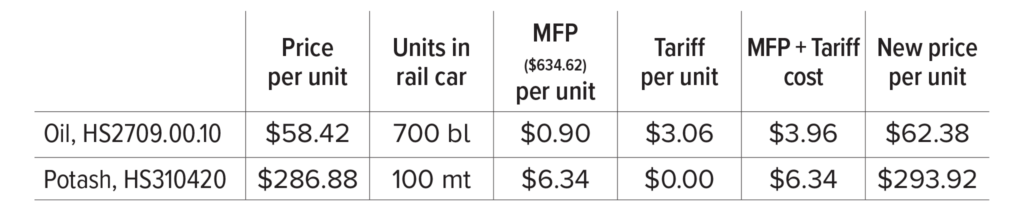 And finally, for now, the return of the Merchandise Processing Fee (MPF) charged by U.S. Customs and Border Protection is in addition to any duty (tariff), in the case CUSMA ends, this would be WTO tariffs. This fee has been waived under Canada’s successive trade agreements with the U.S. and after close to four decades, has been forgotten by many. The cost of the MPF may have higher costs for exporters than the WTO tariffs that would replace CUSMA zero tariffs. Here’s an example for two products shipped by rail to the U.S.