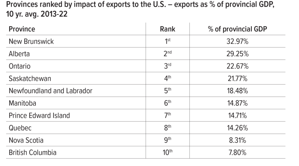 Below is a ranking of the importance of exports to the U.S. by province using per cent of GDP.