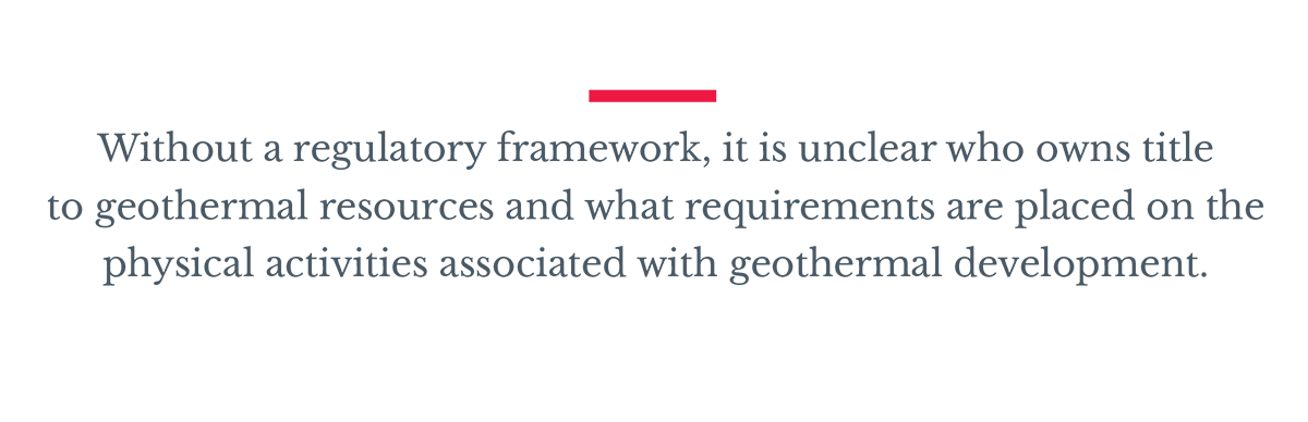 Alberta’s laws do not yet regulate geothermal development – imposing significant uncertainty for would-be geothermal developers. A legal definition of geothermal resources does not exist, and it is not clear who owns them or how the rights to their development can be obtained. It is also unclear how the physical activities associated with geothermal development will be regulated. Ambiguity on these issues is holding back Alberta from developing another source of clean energy.