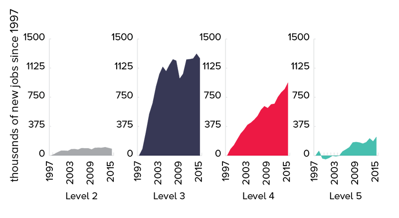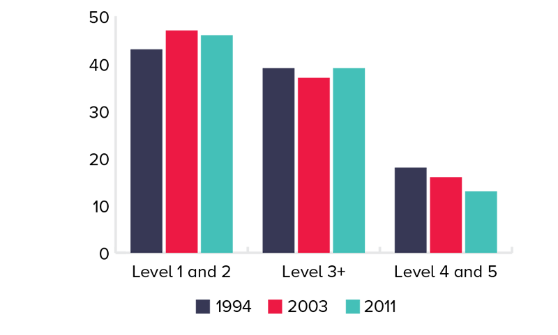 Meanwhile, since 1994, the proportion of people with Level 3 literacy skills has not grown, and the proportion of people at the highest levels has dropped (Figure 2). In 2011, only 54 per cent of the working-aged population had the literacy skills to do 96 per cent of all the jobs in the economy really well.