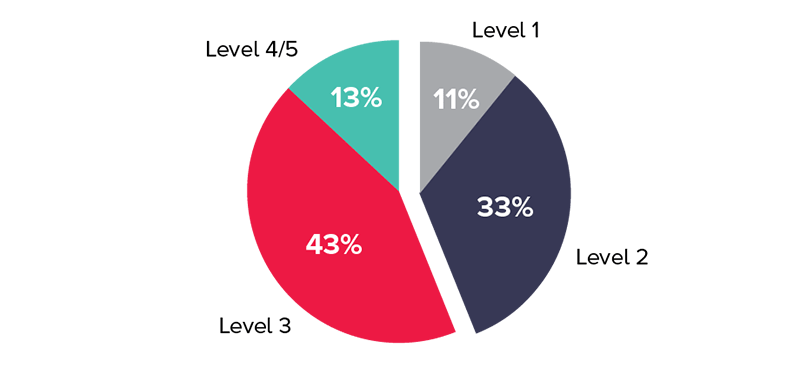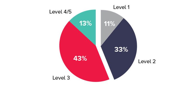 The level of literacy skill demanded by jobs has been rising. People need to have at least Level 3 literacy skills – the mid-point on the five-level scale for literacy – to do the work associated with 97 per cent of jobs created since 1997. At Level 3 and above, people can analyze, evaluate and create new information, which in turn is needed for problem solving and critical thinking. On the other hand, most people with skills below Level 3 can only retrieve information and apply it in routine, predictable ways. In Canada, jobs requiring Level 1 have disappeared, and as shown in Figure 1, there are only a few Level 2 jobs remaining.