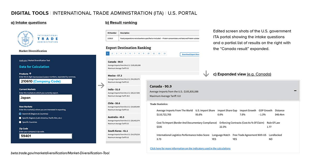 Canada needs to develop an online digital tool that builds upon what the U.S. government has done. Interviews by the Canada West Foundation with the U.S. federal International Trade Administration (ITA) have shed light on how the Americans are advancing. They have created online tools for a simple, digital system that brings U.S. export information into an easy-to-use customer service focused portal.³ The U.S. portal is essentially a skunkworks project undertaken by technical staff in the ITA who were bothered by the same sort of issues that plague Canadian trade support services.4