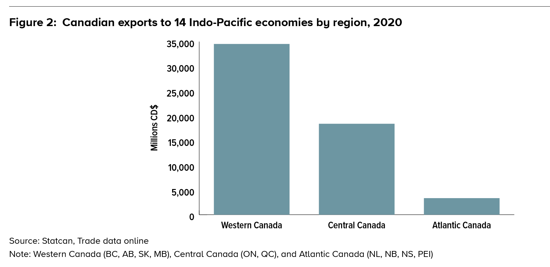 The Prairies are the most export-dependent region of Canada with exports accounting for just under a third of the region’s GDP. The largest export destination for the Prairies is the U.S., followed by Indo-Pacific countries. The figure below shows flows to the 14 key Indo-Pacific markets by Western Canada exceeded those of the rest of Canada by more than $20 billion in 2020.