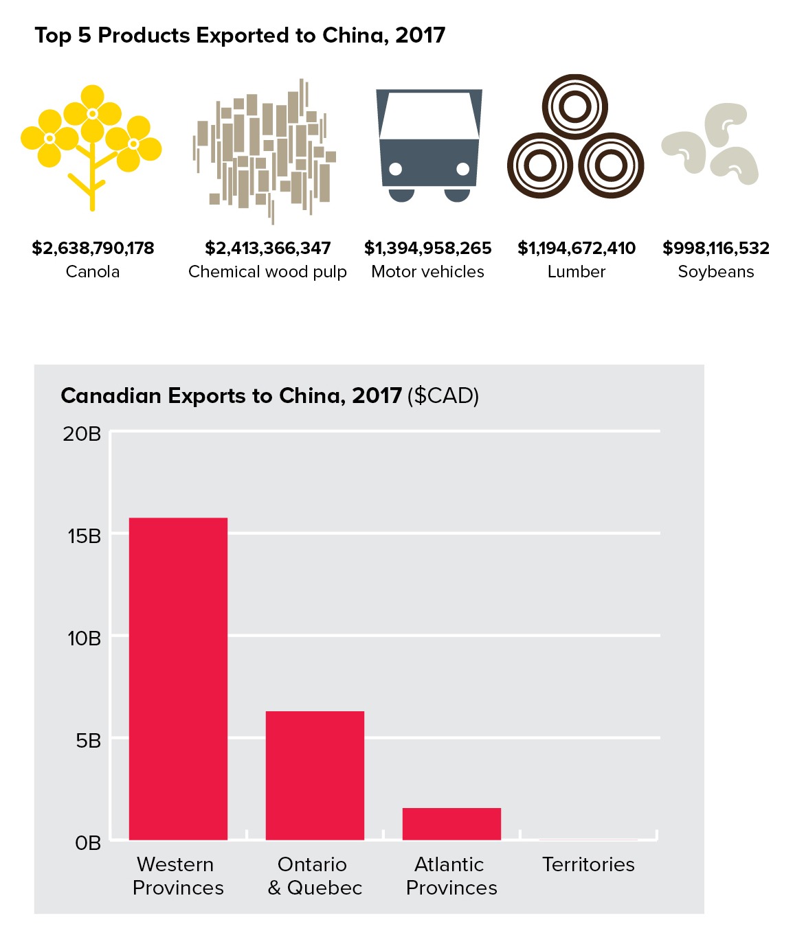 In Canada, trade with China is especially important for the Western provinces. In 2017, British Columbia, Saskatchewan, and Alberta were the top three exporters to China ($6.8 billion, $3.9 billion, and $3.5 billion respectively). Of the top five items in Canada exported to China, four of them are widely produced in the four Western provinces (motor vehicles are the exception).