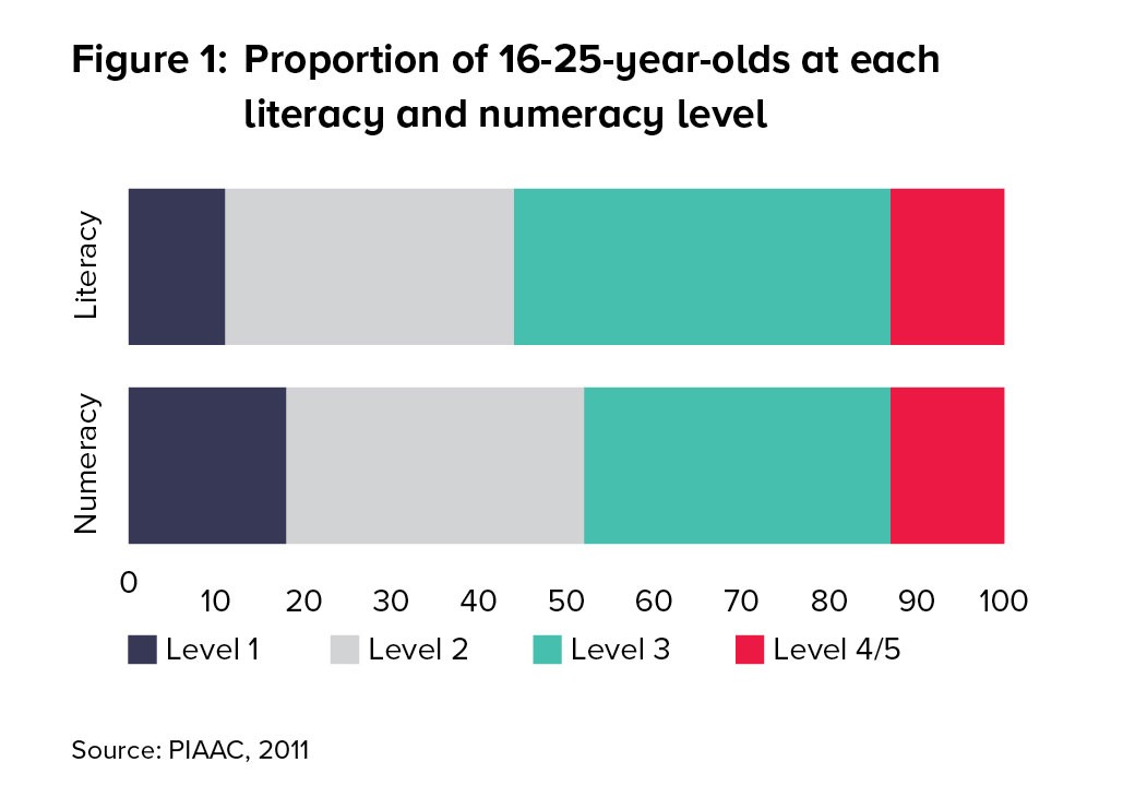 Figure 1 shows the proportion of youth at the different literacy and numeracy levels. The reality is that 44 per cent of youth, many of whom are in PSE programs, do not have the literacy skills they need to learn efficiently. Their basic numeracy skills are even worse – over half of them have low or poor levels of numeracy skill. They have likely taken at least a Grade 10 math course but may not be able to figure out what “30 per cent off” will mean at the cash register.
