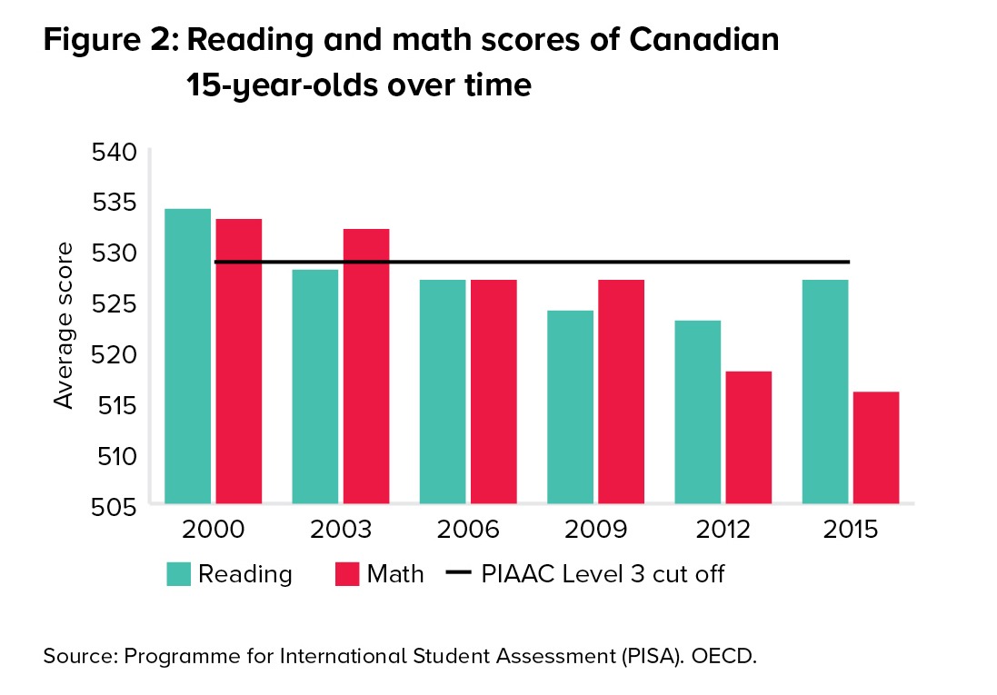 Average reading and math scores at age 15 now fall beneath the OECD’s PIAAC Level 3 cut-off (equivalent to 529 points on the 800-point PISA scale). It’s unlikely that lower youth reading and math scores are a temporary aberration, that the students in high school now are being better prepared and that adult literacy and numeracy scores will, left to themselves, improve.