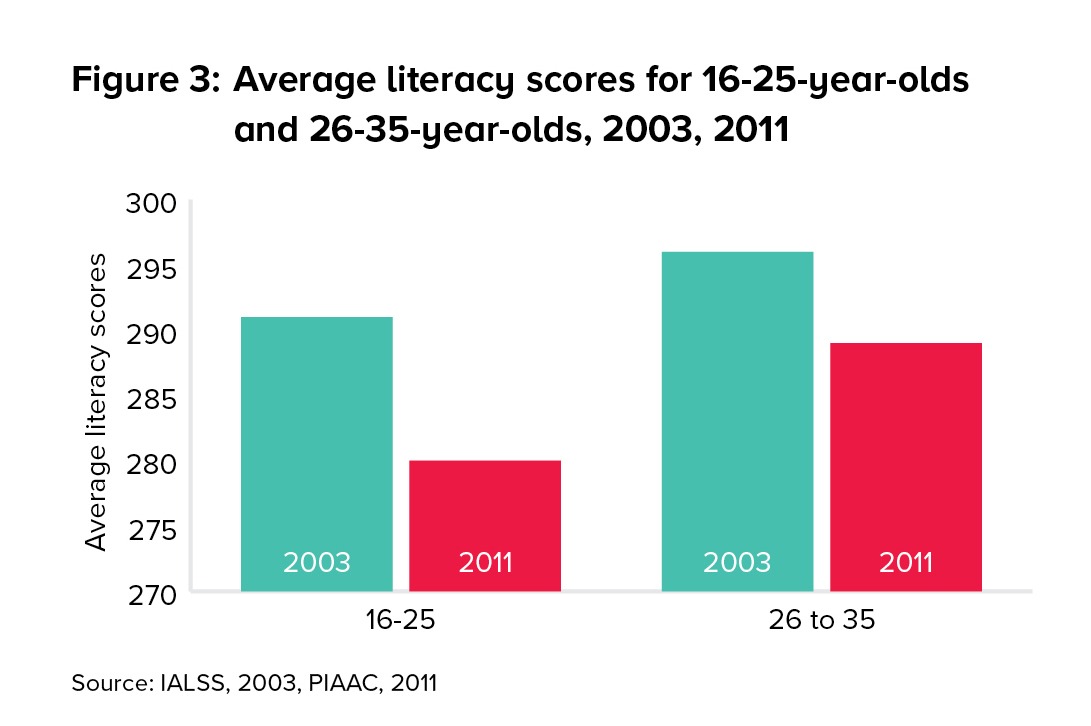 Figure 3 shows that average scores of the youngest age group in the adult assessments, 16-25-year-olds, fell by 11 points between 2003 and 2011, to only five points above the Level 3 literacy skill cut off (275 on the 500 -point PIAAC scale). The fact that the average literacy score sits so close to the threshold between Level 2 and 3 implies that a non-trivial proportion of youth in this age range have very low scores. Readers with Level 2 literacy skills are only able to read well enough to apply procedural knowledge routinely, a level of task difficulty that is easily handled by automated machine processes. Level 3 is the level at which readers begin to analyze, evaluate and apply what they have read in new and different situations and to fluidly problem-solve.2 It is also the level required for 97 per cent of the new jobs in the economy.3