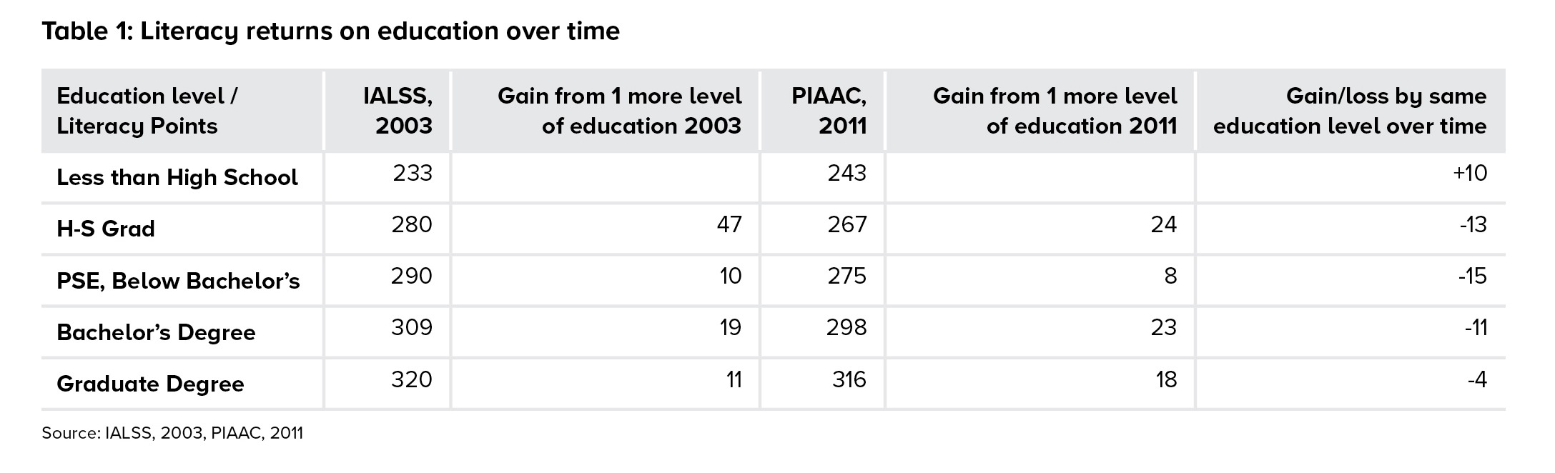 Table 1 also shows that high-school and post-secondary education below the degree level are not increasing literacy skills as much as they did in the past.