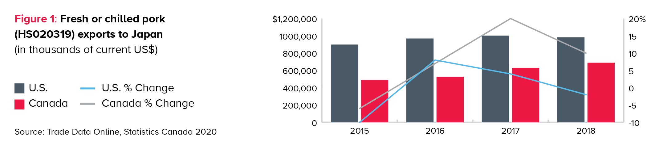 Nevertheless, Canada has gained traction over the U.S. for fresh or chilled pork in Japan. Canada represents 40% of the Japanese fresh or chilled pork market, after the U.S. (57%) as of 2018 (Diagram 2). Coupled with the one-year advantage over the U.S. in tariff benefits for fresh or chilled pork and a market strategy that focuses on higher quality, Canada may capture the total estimated gains of US$255 million. Diagrams 1 and 2 show Canada’s growing market share at the expense of the U.S. Furthermore, Canada already exports more than the U.S. for some products such as prepared or preserved pork meat and offal, pig fat and frozen bone-in ham – Alberta, on average, exports the equivalent of all of the U.S. to Japan.