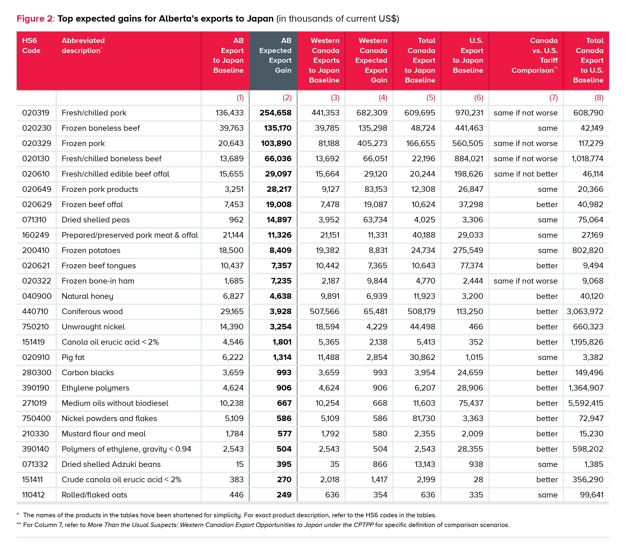 Figure 2: For each product, Columns 1 and 3 displays the five-year (2014-2018) average baseline of Alberta and Western Canadian exports to Japan. Columns 2 and 4 are the calculated total expected export gains for Alberta and Western Canada respectively. Columns 5 and 6 compares the historical five-year average (2014-2018) of Canada export and U.S. export to Japan for additional insights on the degree of Canadian export competition with the U.S. for Japan. Column 7 compares Japan’s tariff schedule under the CPTPP with the U.S.-Japan agreement to identify products where Canada has the same, better or worse provisions than the U.S. for potential areas of export competition. Column 8 shows the historical five-year average (2014-2018) of Canada export to the U.S.