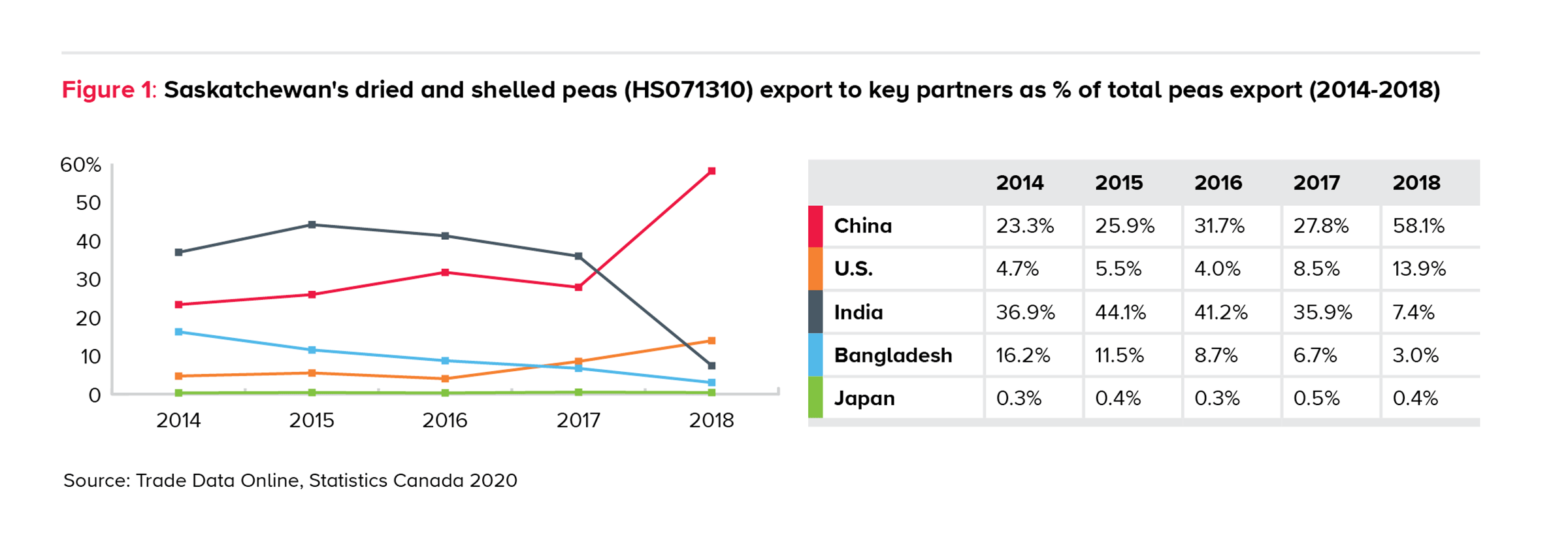 Dried shelled peas expect the largest gains for Saskatchewan with an estimated total gain of US$48 million (Column 2) from the five-year average (2014-2018) baseline of US$3 million. This presents significant export opportunities for Saskatchewan as the majority (73%) of Canadian dried shelled peas export to Japan already come from Saskatchewan (Alberta is ranked second with 24%). Under the new U.S.-Japan trade deal, the U.S. received the same tariff provisions as Canada with Japan. However, this may not necessarily be bad news for Canada if Canadian dried shelled peas act as a backfill to the U.S. supplies. If this is the case, the tariff reduction under the U.S.-Japan agreement may benefit Saskatchewan as a result of integrated supply chains. Canada already exports on average US$75 million of dried shelled peas to the U.S. – almost 19 times more than sold directly to Japan (compare column 8 with 5). The peas market in Japan has traditionally been very small for Canada. Japan is ranked as the 19th largest dried shelled peas market for Canada and 20th dried shelled peas import partner for Saskatchewan. Figure 1 shows the change in export market composition by percentage over the last five years from 2014 to 2018. Saskatchewan’s export to Japan has been stable at an average of 0.4%. However, given the issues Canada has been facing with some of its largest markets for peas, such as India, the overall tension with China and the recent U.S.-China phase one deal of guaranteed agricultural commitments, the CPTPP agreement presents opportunities and provides a structured rules-based market for peas. Therefore, more market development resources should be made available to target Japan for pulses such as peas.