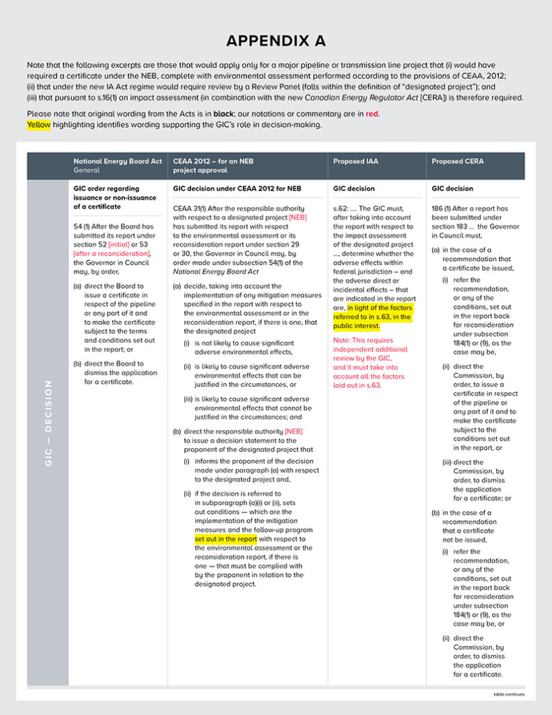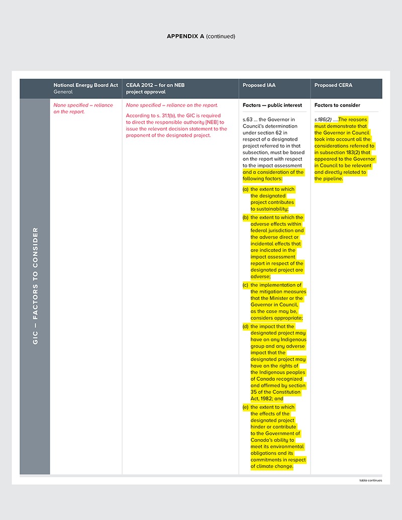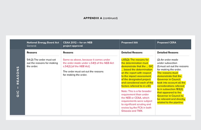 • The language set out for decision-making by the GIC in the IA Act should not be expanded this way, but revert back to what has been opined on and approved by the courts. See Appendix A for a comparison of the language of today (NEB Act and CEAA 2012) versus what is proposed in Section 65(2) of the IA Act for GIC decision-making.