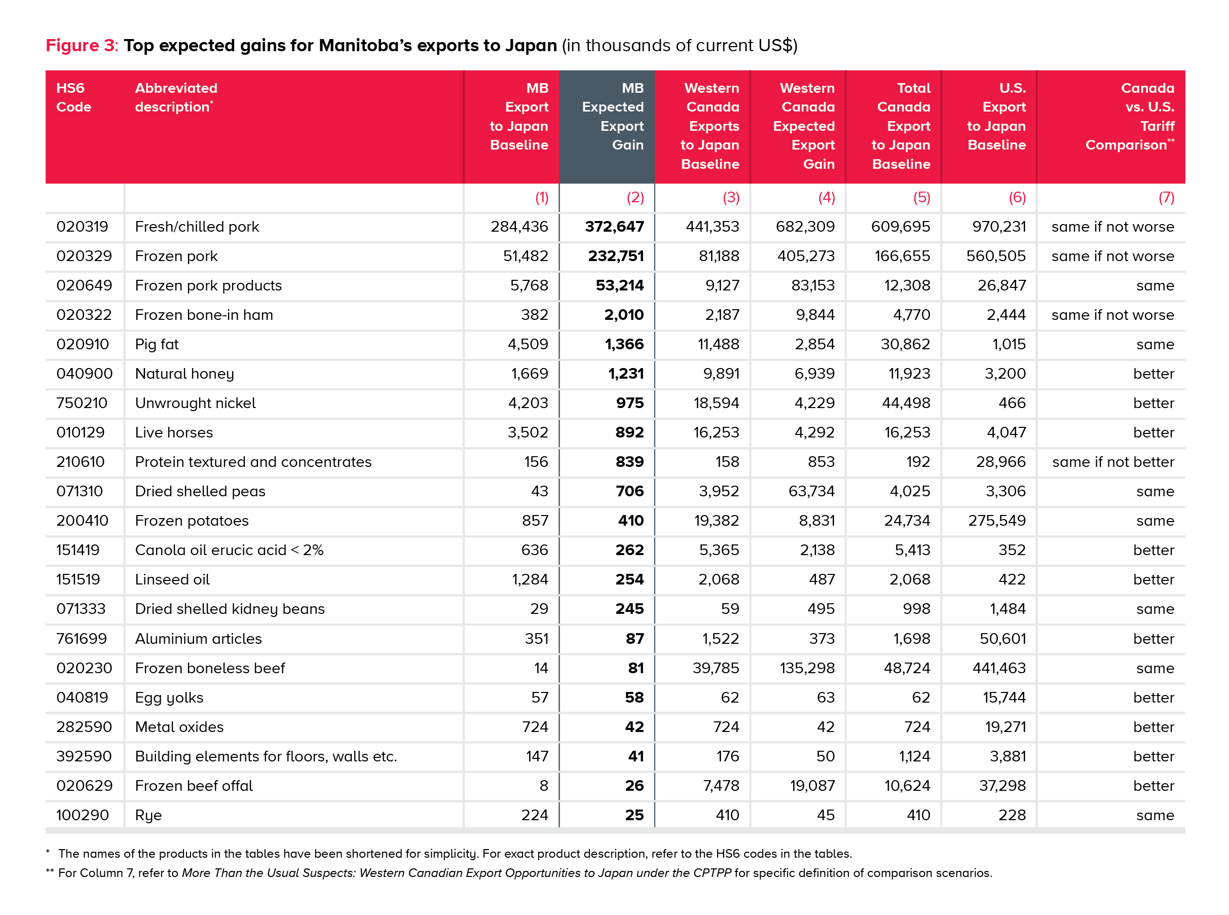 Figure 3 illustrates some of the top expected export gains for Manitoba with Japan as a result of tariff reduction and trade diversion under the CPTPP, and the potential impact of U.S. competition from the recent U.S.-Japan partial deal, effective January 2020. The table is rank ordered from largest to smallest expected Manitoba export gain (Column 2).