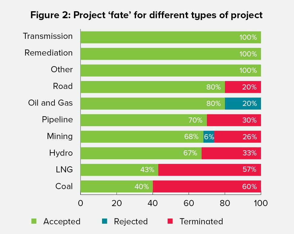 As shown in Figure 2, not all project types were equally likely to exit the EA process with a certificate. Electricity transmission and soil remediation projects had the best chances of receiving approval; hydro (which included dams, weirs and run-of-river), LNG and coal projects the least.