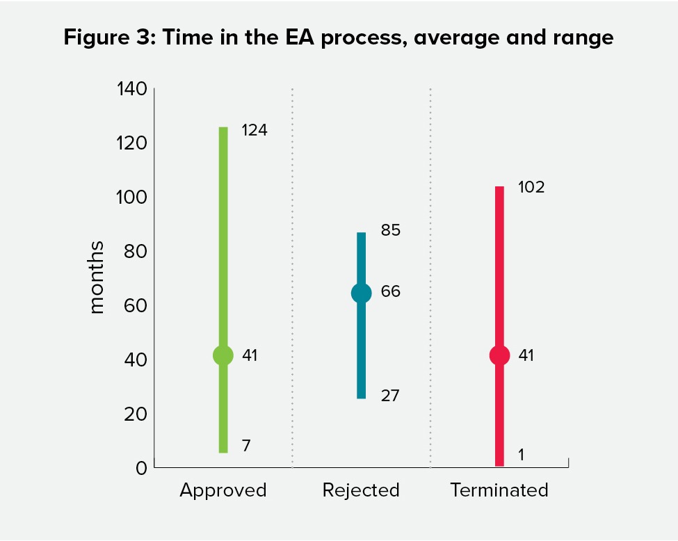 A key problem that this research has confirmed is that the EA process can take a very long time. Figure 3 shows the time it takes from the commencement of the EA to receiving a decision or having the EA terminated. On average, it took 41 months (almost 3.5 years) for a project to either receive approval or for the proponent to pull the plug. The range was large, with the high end at 124 months – over 10 years. These findings are consistent with other research that has been done on select projects under federal regulatory review. [1]