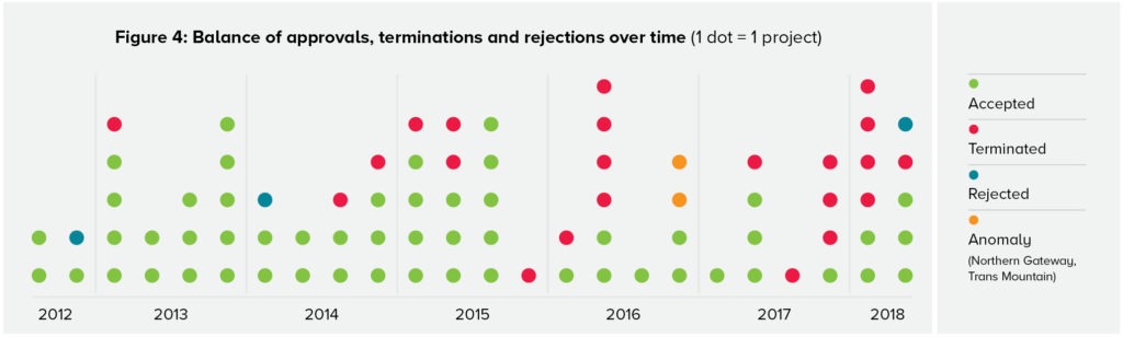 Finally, it is interesting to note how the patterns of project approvals, rejections and terminations may be changing over time. Figure 4 shows the date when projects were approved (green dots), rejected (blue dots) or terminated (red dots). (The orange dots represent Northern Gateway – which received approval and then had approval withdrawn, and Trans Mountain – which received approval which has not yet been enforced.) An increasing number of projects are being terminated rather than receiving approval. Is this due to changes in market conditions, Canadian competitiveness for investment, industry uncertainty, regulatory scope or other hurdles? Further analysis will help us uncover whether there are any true patterns in the data.