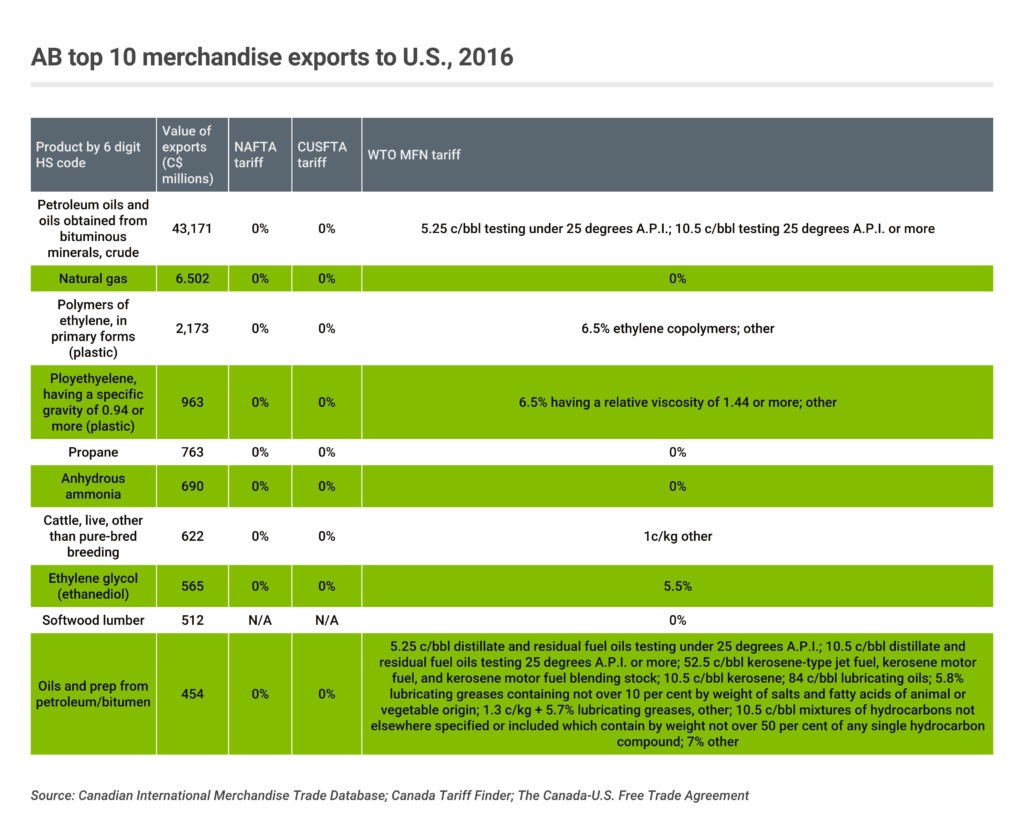 None of Alberta’s top exports to the U.S. would face tariffs under CUSFTA; these products either had all tariffs eliminated by 1993, right before NAFTA kicked in, or did not face export tariffs in the first place.