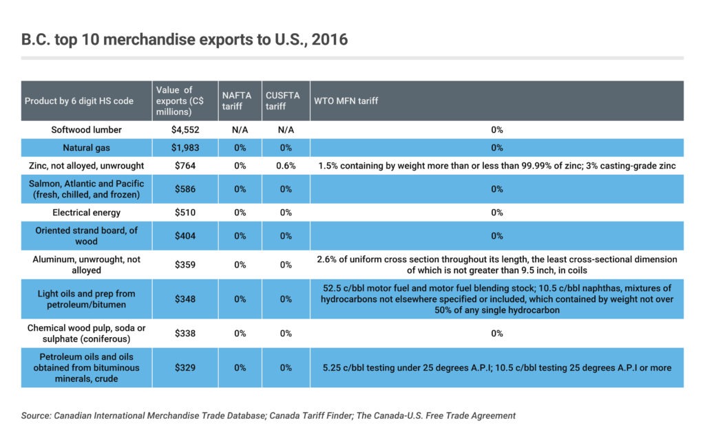 Only one of B.C.’s top exports to the U.S. (zinc) would be subject to a tariff under CUSFTA, because it is in the category of products that had tariffs phased out over 10 years. Since CUSFTA would kick back in year six, zinc exporters would pay decreasing tariffs for the next four years until the tariff is eliminated to zero. This would not be too burdensome as the CUSFTA tariff rate would be less than one per cent.