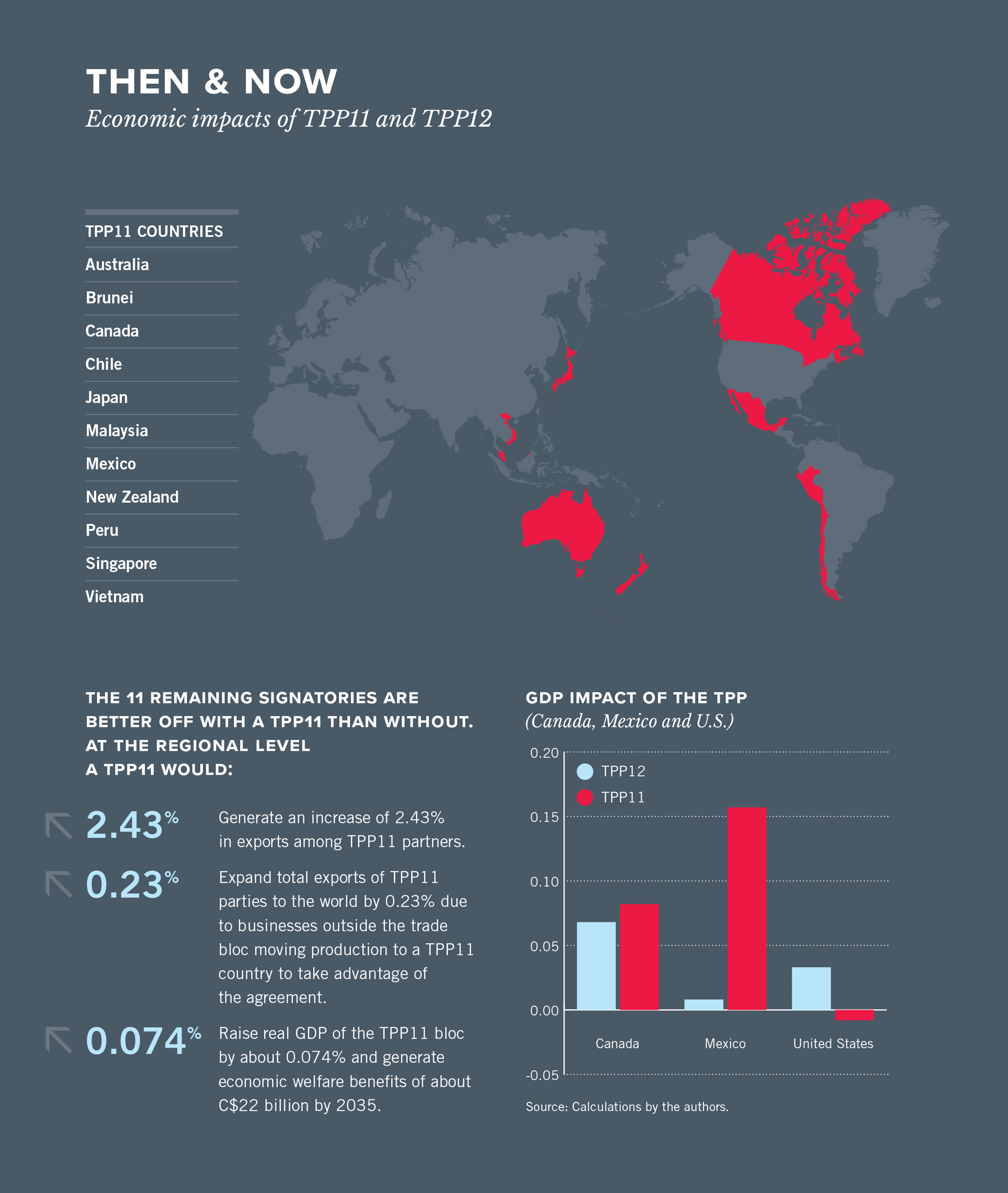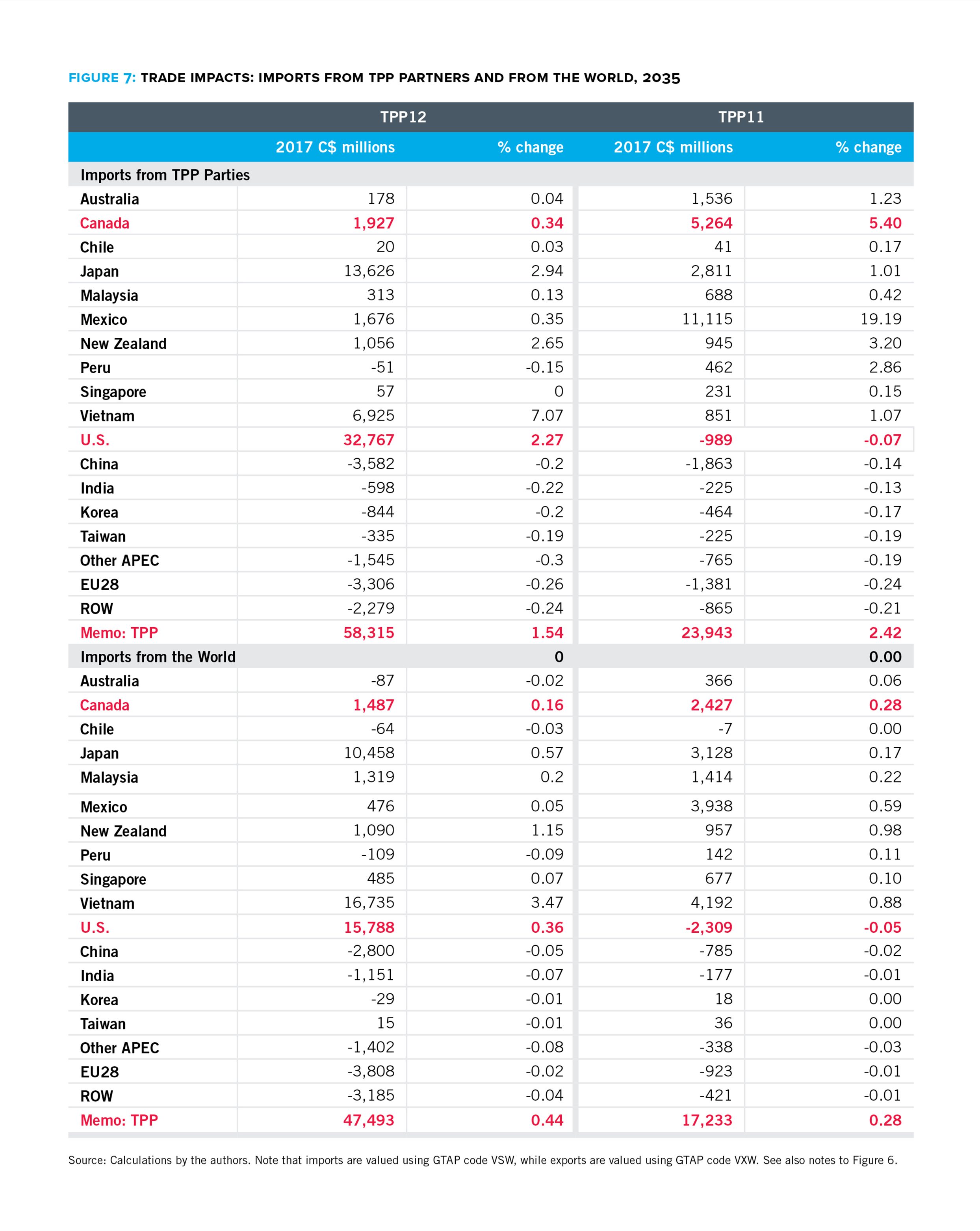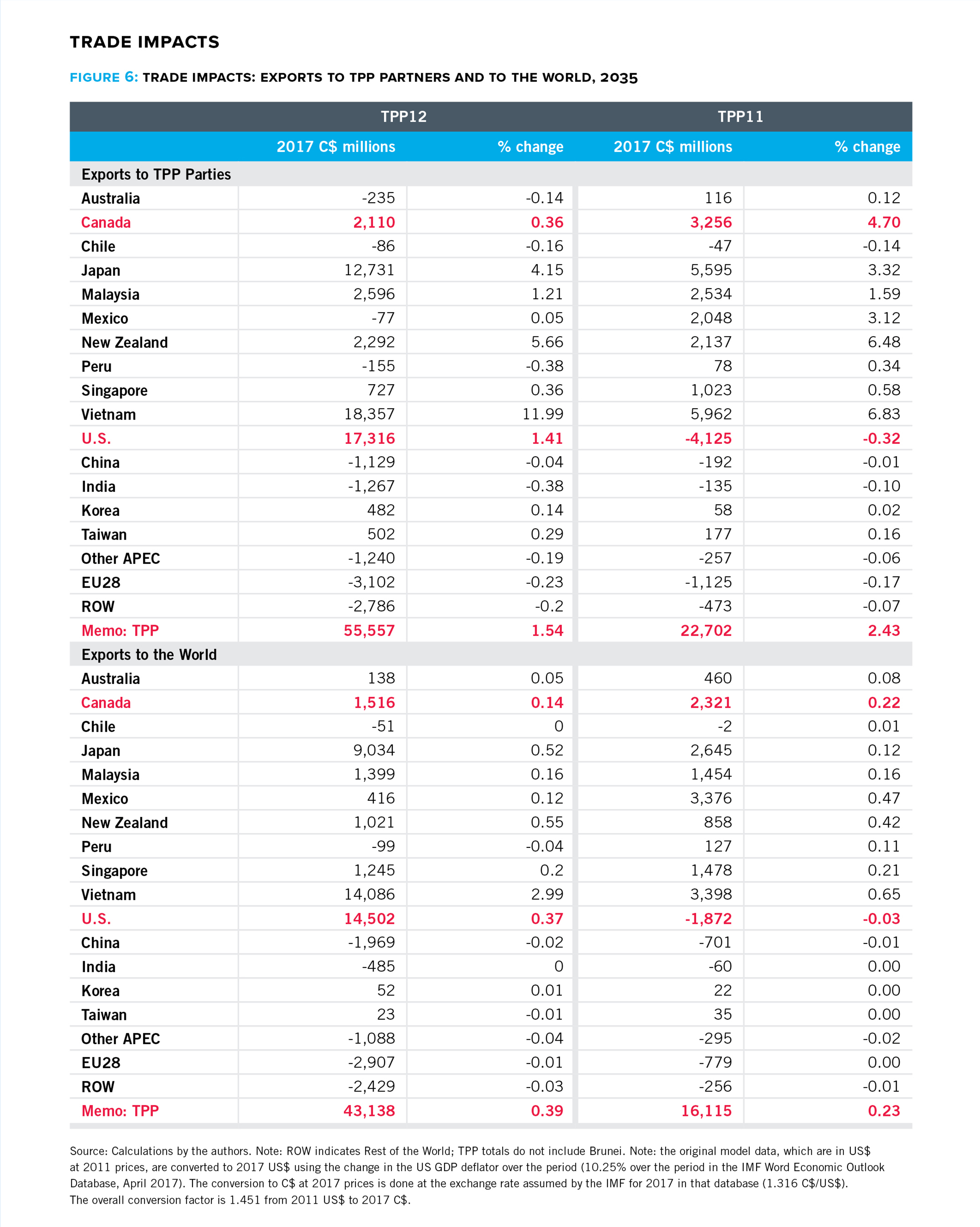 This report begins to fill that gap. Our modelling and analysis shows how Canada and other TPP signatories would fare under a TPP11; what the U.S. stands to lose; and, how the agreement would affect different sectors of the economy, including how changes in one sector will impact other sectors. The findings provide quantitative evidence to each country as it decides whether to forge ahead on the pact without the U.S.