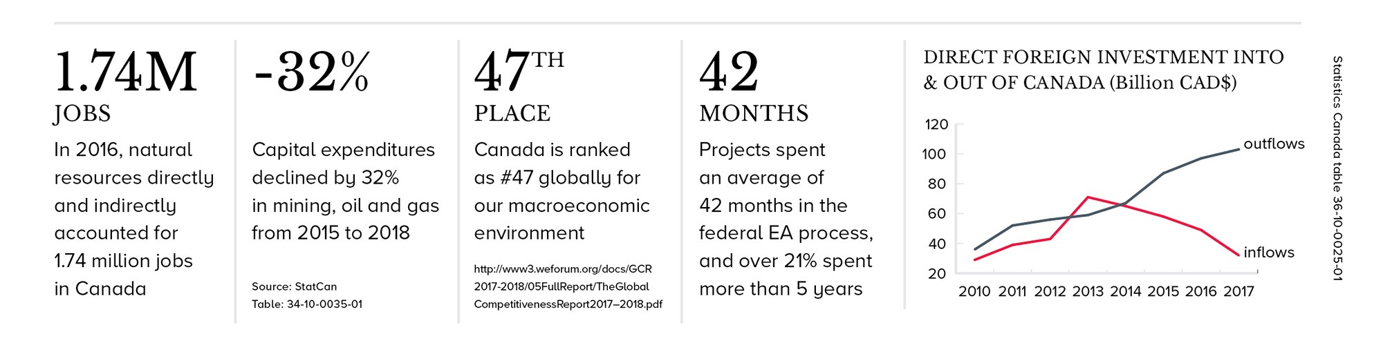 All of that is beyond our control – but here at home we’re just making things worse. Canada’s natural resources have been the backbone of Canada’s economic prosperity, but Canada’s investment climate for major resource-related projects has deteriorated as regulatory burdens and politically motivated decisions have rendered Canada a difficult place to get anything of significance built. Foreign investment is going elsewhere – and perhaps even more telling, so is Canadian investment. Rather than attracting critical investment, we are turning it away.