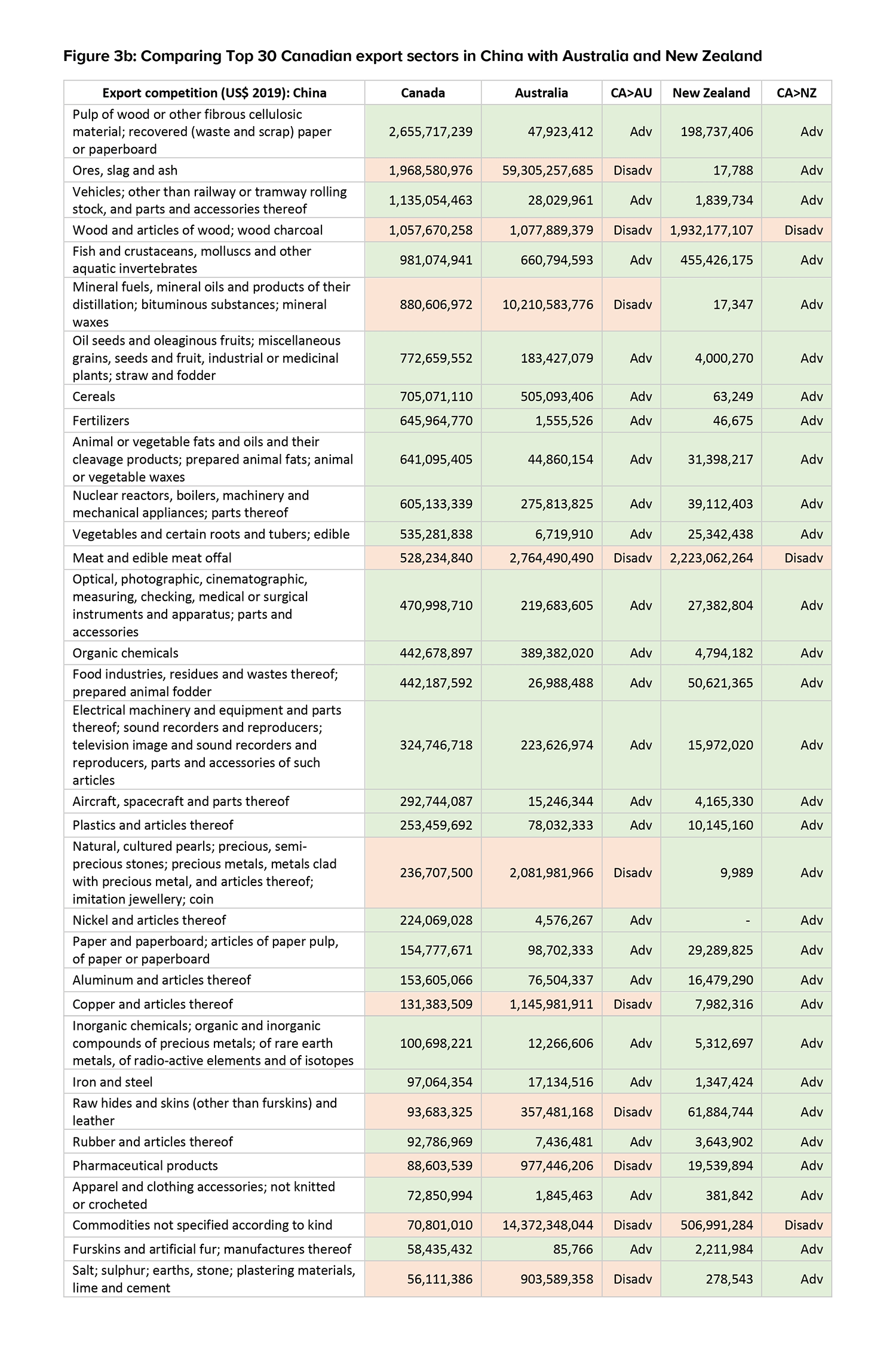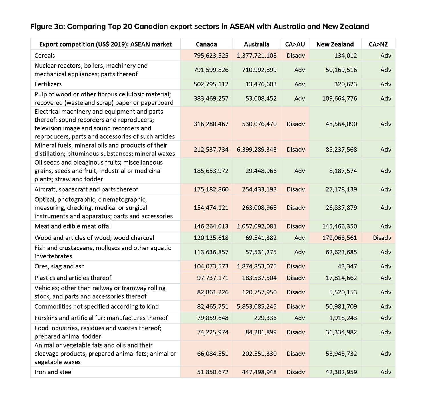 Figure 3 compares the Top 20 Canadian export sectors in ASEAN and Top 30 Canadian export sectors in China with Australia and New Zealand. For ASEAN, Australia has a competitive advantage and exports more than Canada in 13 of Canada’s top exports with ASEAN. New Zealand only has a competitive advantage and exports more than Canada in one area with ASEAN – wood and articles of wood. On the other hand, Canada has a competitive advantage over Australia and New Zealand in the majority of its Top 30 key exports to China. Australia only exports more than Canada in eight areas with China and New Zealand only two. The data shows that there are many common sectors that Canada, Australia, and to a lesser extent New Zealand, exports to ASEAN and China. In the case of ASEAN, where Australia and Canada have more areas of competition, further supply chain integrations under the RCEP would mean further falling behind for Canada. In the case of China, the further integration initiated by RCEP may threaten the areas where there is currently less competition and where Canada currently exports more. Finally, while there are some areas of immediate competition identified, there are many sectors in which Canada does not compete with New Zealand and Australia, presenting opportunities to cooperate and complement each other. This signals the opportunities the RCEP bloc presents to Canada. This also signals the importance for Canada to work with Australia and New Zealand, under the CPTPP, to bridge their supply chain presence, network and know-how to access markets for both products that Canada is already good at and has a strong presence in, as well as products that Canada has a lesser presence in the market.