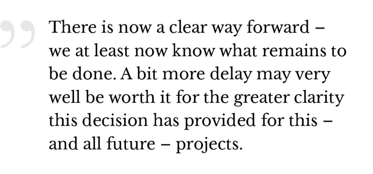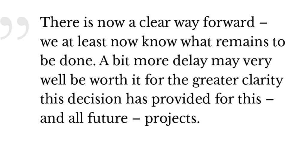 The court also, in several places, acknowledges the desire to avoid delay: “In largest part the concerns of the Indigenous applicants were quite specific and focussed and thus quite easy to discuss, grapple with and respond to. Had Canada’s representatives met with each of the Indigenous applicants immediately following the release of the Board’s report, and had Canada’s representatives executed a mandate to engage and dialogue meaningfully, Canada could well have fulfilled the duty to consult by the mandated December 19, 2016 deadline.” This is clearly not a court saying “no” to the project; it is, instead, a court saying how to get it done.