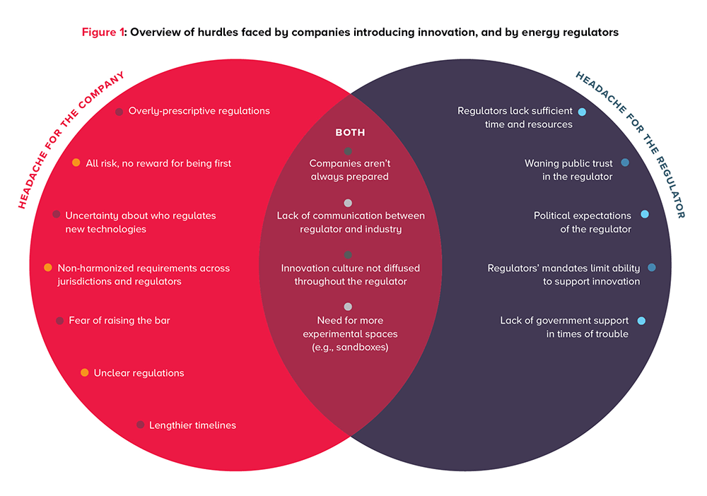 We identified 16 key hurdles that energy innovators and energy regulators may face when attempting to introduce innovation. As shown in Figure 1, some represent headaches that primarily are experienced by the companies introducing innovation; others represent pressures that energy regulators themselves face.