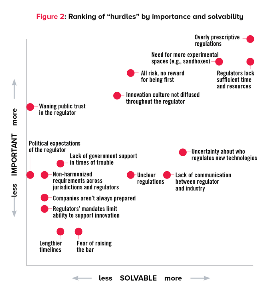 Not all the hurdles identified in this policy brief are equally important – nor are they all equally solvable. Participants who attended a January 2019 workshop on this issue ranked each of the identified problems in terms of their importance and solvability. The results are shown in Figure 2. The three hurdles that were identified as the most important were: a) overly prescriptive regulations; b) the need for more experimental spaces such as sandboxes; and c) the need for the regulator to have sufficient time and resources to develop expertise on new technologies. Interestingly, these three hurdles were also ranked by participants as among the most solvable among the issues identified.