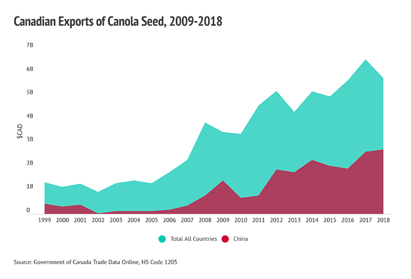 • Canola is one of Canada’s largest exports to China. In 2018, Canada exported more than $2.7 billion worth of canola to China, nearly half of Canada’s total canola exports.